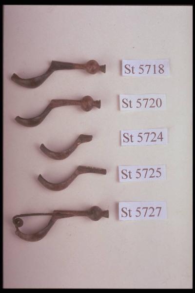 Fibula a sanguisuga con arco pieno, sezione piano convessa, arco decorato alle estremità da fasci di linee incise. Lunga staffa con terminazione a globetto e appendice troncoconica piena