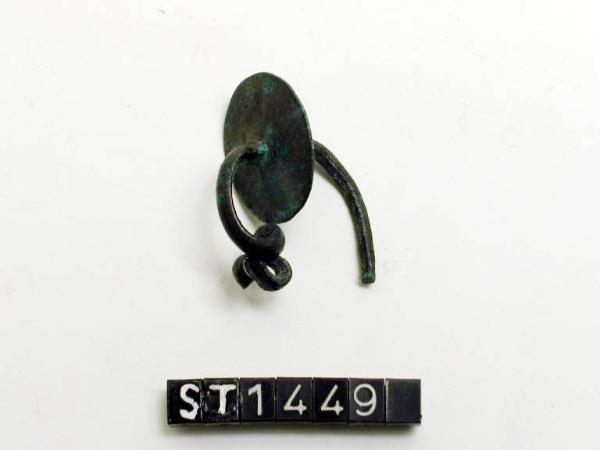 Frammento di staffa di fibula desinente a globetto con appendice troncoconica piena e frammento di arco serpeggiante con disco fermapieghe, probabilmente pertinenti alla stessa fibula.