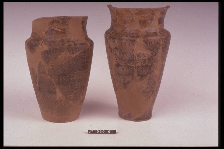 Vaso situliforme con orlo appena esoverso, decorato a impressione sul collo da motivi a S rovesciate, sulla spalla da cerchietti concentrici, sul corpo da motivi a S e a 8. Colore non omogeneo bruno nerastro.