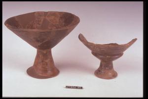 Coppa a corpo troncoconico, alto piede strombato. Colore di superficie non omogeneo, a tratti bruno e a tratti nero, semiopaco.