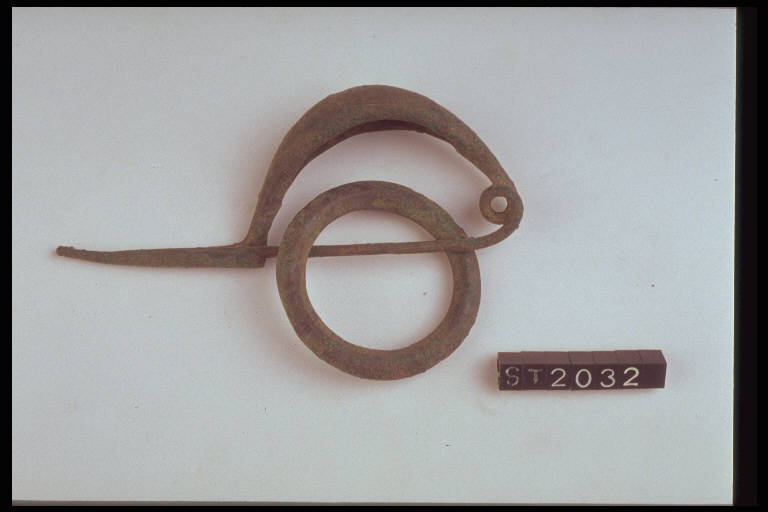 Fibula a navicella con lunga staffa, arco decorato a incisione da fasci di linee parallele sopra la molla e la staffa; da tratti paralleli disposti a zig-zag sulla sommità dell'arco. Sull'ago è infilato un anello a sezione biconvessa