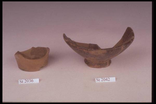 Fondo piano e attacco di parete di recipiente ceramico di cui non è possibile stabilire la forma. Colore grigiastro con tracce nere di colore sulla superficie esterna