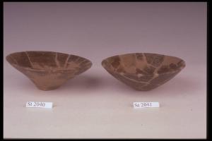 Ciotola a corpo troncoconico, orlo piatto, fondo piano. Colore bruno nerastro.