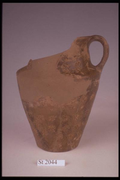 Boccale a corpo troncoconico con ansa a nastro impostata fra orlo e spalla. Decorazione costituita da una fila di rosette impresse. Colore bruno nerastro.
