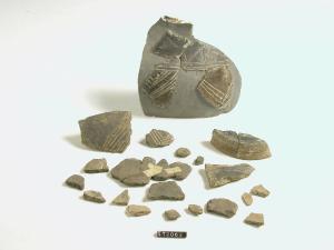 Urna biconica ovoidale con basso piede obliquo decorato da due solcature, corpo decorato a incisione da un motivo a zig-zag compreso tra due linee parallele; più sotto, sono incisi tratti paralleli disposti a spina di pesce. Uno dei frammenti presenta una piccola presa a bugna. Colore nerastro