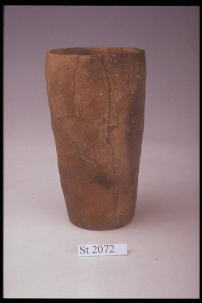 Bicchiere a corpo quasi cilindrico e fondo piano, orlo appiattito; colore non omogeneo, nocciola con chiazze nere