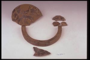 Doppiere di cui rimangono: a) bracci semilunati a sezione quadrangolare; b) coppa con orlo distinto e fondo piano; decorati ad incisione da file di S rovesciate. c) frr. della 2° coppa (o della 1° abbondantemente integrata con gesso ?) decorata da S rovesciate e cerchietti concentrici d) frr. del piede svasato a tromba. Colore nerastro.