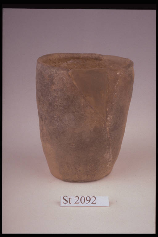 Bicchiere a corpo quasi cilindrico e fondo piano; colore non omogeneo, bruno, con ampie chiazze nerastre