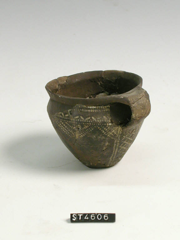 Boccale a corpo troncoconico con ansa a nastro impostata fra orlo e spalla, piccolo orlo esoverso, breve spalla a spigolo vivo. Decorazione costituita da due file di tacchette sulla gola, da motivi a zig-zag sulla spalla, da un motivo a reticolo compreso tra due file di tacchette sotto l'ansa. Ansa decorata a spina di pesce. Superficie bruno-nerastra.