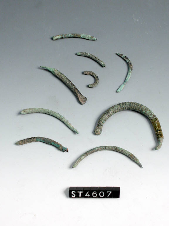 Fibula ad arco semplice con decorazione incisa a spirale.
