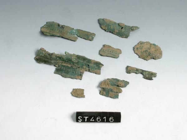Frammenti di corpo di cista a cordoni in lamina bronzea; tra un cordone e l'altro una fila di puntini ottenuti a sbalzo