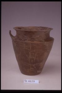 Vaso situliforme con ansa a nastro impostata su orlo e spalla. Colore nocciola, superficie nero-lucida.