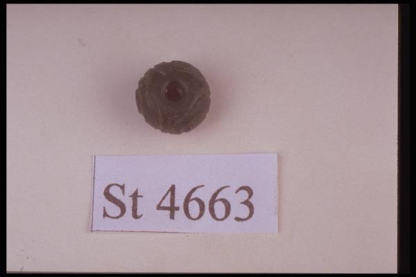 Perline di pasta vitrea nera con decorazione a cerchi concentrici gialli.