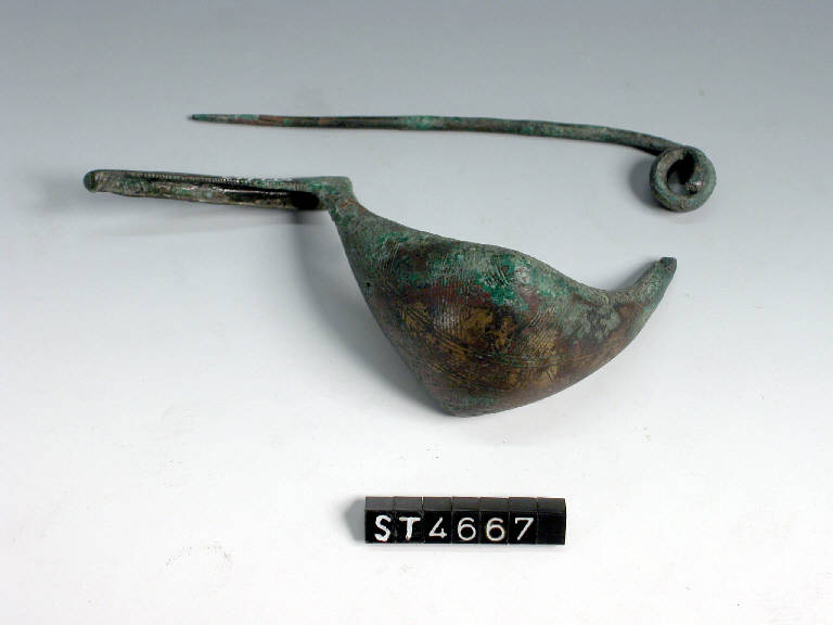 Fibula a navicella romboidale e lunga staffa, arco decorato ad incisione da fasci di linee parallele disposte a zig-zag e da fasci longitudinali che comprendono motivi metopali.