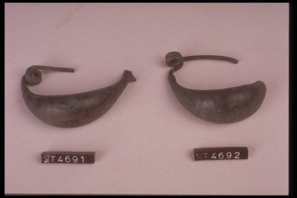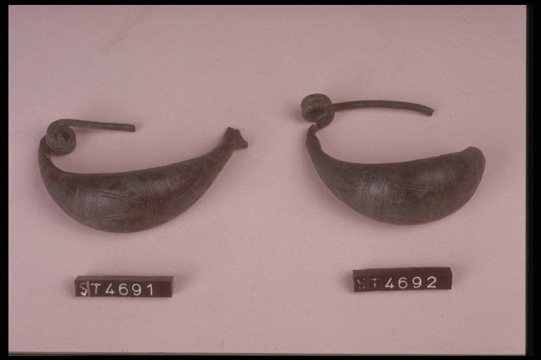 Fibula a navicella con sezione a C, corpo a decorazione lineare incisa.