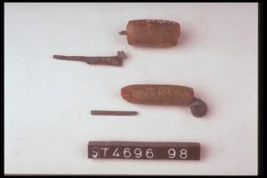 Elemento in ambra di forma tubolare a sezione circolare con foro passante, pertinente ad una fibula ad arco composto. Si conserva un frammento di legno con inserimento di un frammento di arco di bronzo.