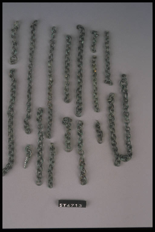 Frammenti di catenella costituita da una maglia di anellini di filo di bronzo avvolto a spirale e di doppi anellini accostati.