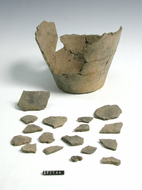 Urna di cui rimangono il fondo piano e la parte inferiore del corpo troncoconica. Colore grigio nocciola.