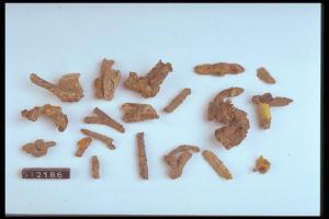 Frammenti di ferro deformati per effetto termico con ossa combuste incrostate. Frammenti pertinenti a fibula ad arco serpeggiante.