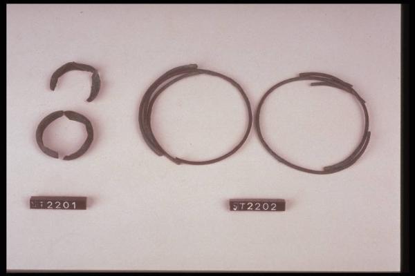 Frammenti pertinenti a due anelli di lamina bronzea con sezione a V.