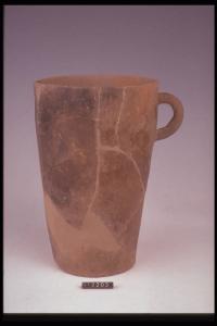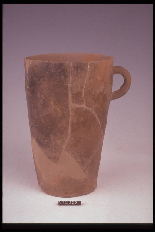Boccale a corpo subcilindrico con ansa verticale ad occhiello impostata sotto l'orlo, fondo piano, orlo arrotondato. Colore bruno con chiazze nerastre.
