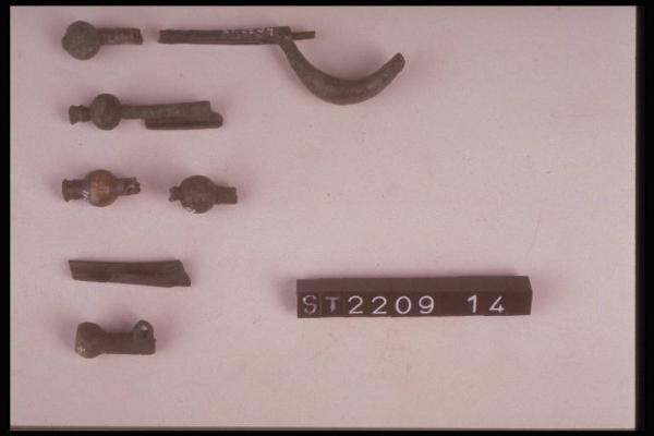 Estremità di staffa di fibula a sanguisuga, terminante a globetto e appendice troncoconica profilata.