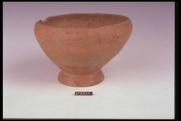 Ciotola coperchio a corpo troncoconico, orlo rientrante curvilineo, basso piede troncoconico. Modellato a mano. Colore bruno.