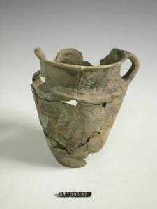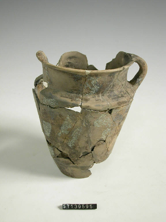 Boccale a corpo troncoconico con ansa a nastro. Superficie bruno marrone.