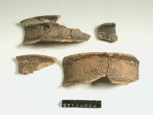 Frammenti di orlo e collo probabilmente pertinenti a uno stesso recipiente decorato a stampiglia.