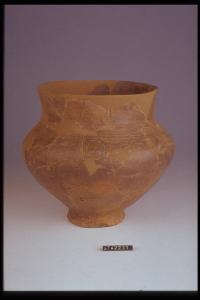 Urna cineraria a ventre rialzato decorato da cinque bugnette lungo il diametro massimo; decorazione incisa a linee parallele.