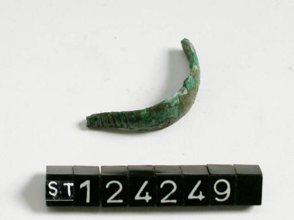 Fibuletta ad arco pieno con fasci di linee incise sopra la staffa e l'arco.