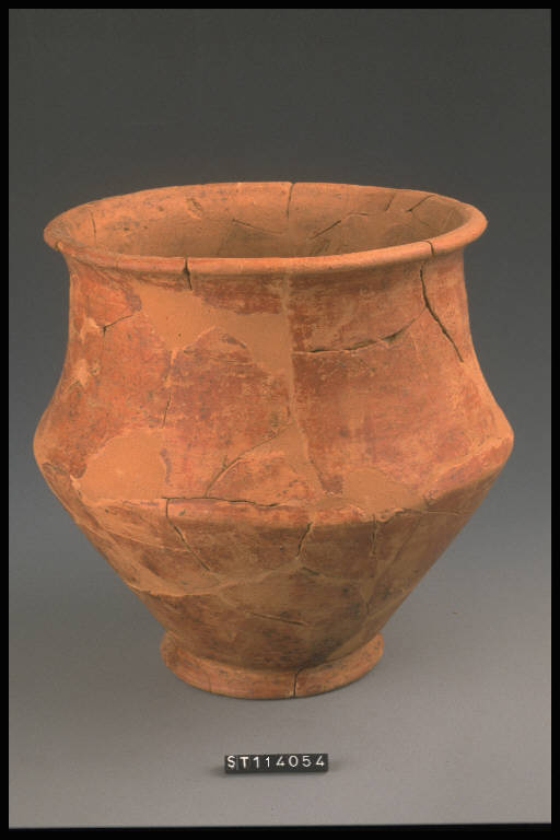 Urna biconica decorata a stralucido rosso nella parte superiore con motivi a onde e a fasce.