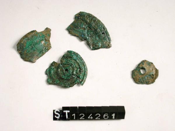 Frammenti pertinenti ad almeno due dischi di lamina bronzea decorati a sbalzo.