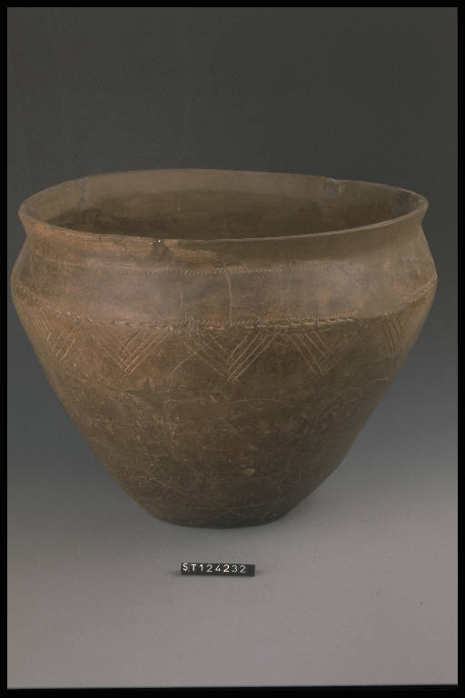 Urna a corpo troncoconico, spalla arrotondata con decorazione a denti di lupo lungo il diametro massimo (vedi annotazioni).