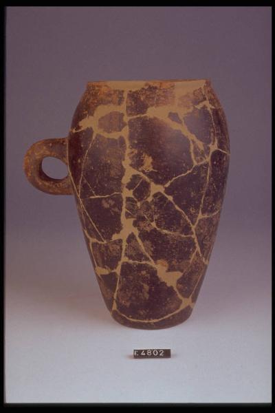 Boccale a corpo troncoconico con ansa verticale ad occhiello, orlo cordonato.