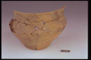 Urna a ventre rialzato decorata da cinque linee parallele incise lungo il collo; una bugnetta sul diametro massimo.