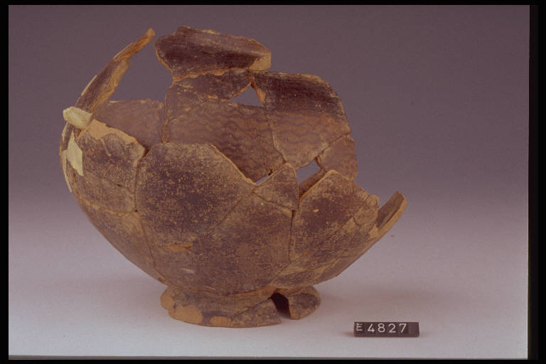 Urna a corpo biconico arrotondato su basso piede obliquo, decorata da linee ondulate a stralucido nero (vedi annotazioni).