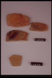 Tre frammenti di parete di recipiente di forma non riconoscibile con decorazioni brune e nere (vedi annotazioni).