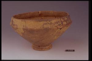 Ciotola a corpo troncoconico, orlo rientrante, basso piede obliquo.