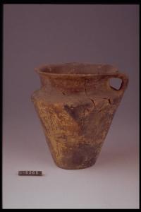 Boccale situliforme con ansa a nastro, spalla spigolosa.