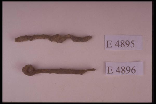 Frammenti di ferro probabilmente pertinenti a una fibula ad arco serpeggiante.