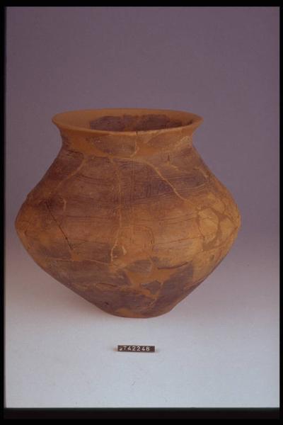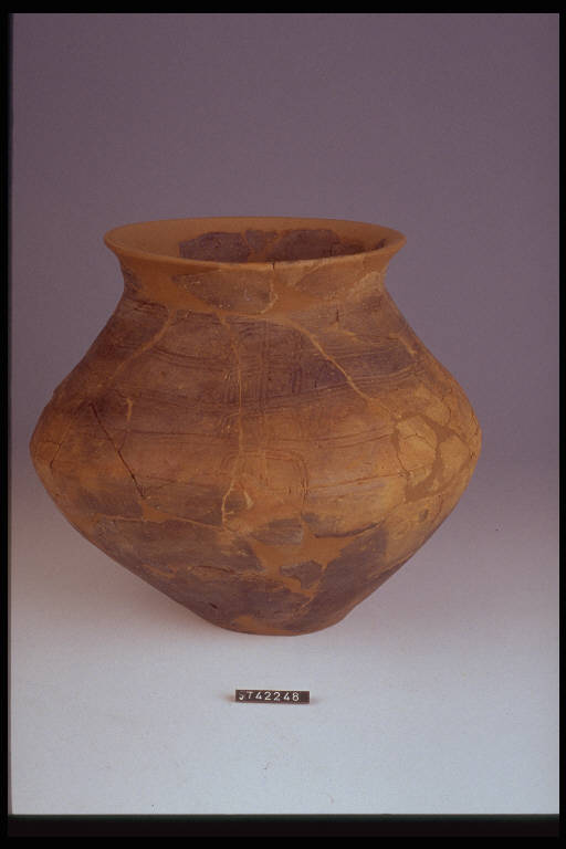 Urna biconica decorata nella parte superiore da fasci di linee parallele incise e da motivi semicircolari e a "L".