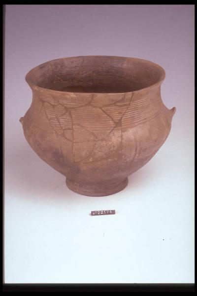 Urna biconica con quattro prese a lingua lungo il diametro massimo; decorazione di linee parallele incise lungo la gola.
