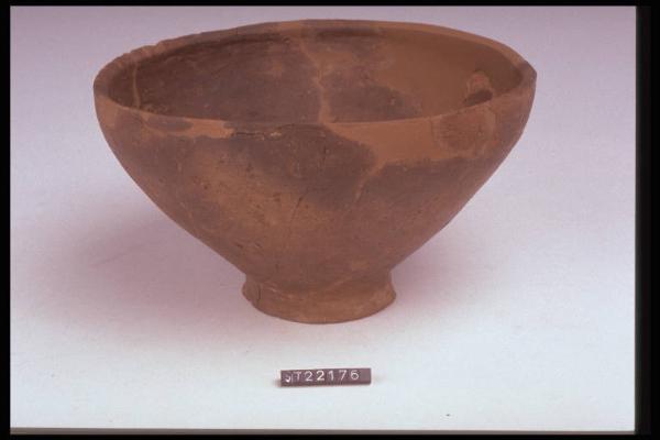 Ciotola a corpo troncoconico, orlo leggermente rientrante, basso piede obliquo.