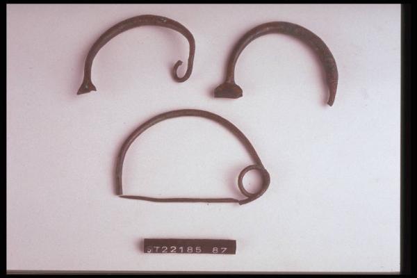 Fibula ad arco ingrossato e costolonato, con decorazione a linee parallele sopra la staffa.