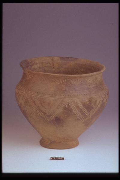 Urna a corpo troncoconico, spalla arrotondata, decorata da quattro bugnette lungo il diamtero massimo; decorazione a falsa cordicella di motivi triangolari e a denti di lupo.