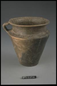 Boccale situliforme con spalla a spigolo vivo, ansa a nastro verticale