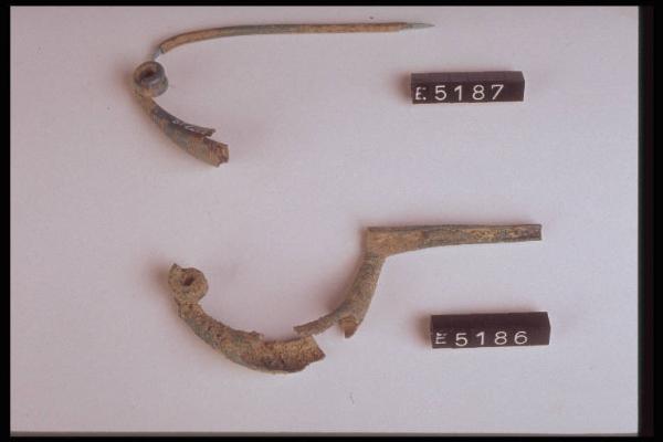 Si conservano due elementi comprendenti la molla e parte dell'arco e la staffa con parte dell'arco, probabilmente pertinenti alla medesima fibula a navicella