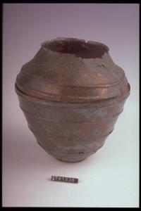 L'olla si compone di due parti attualmente staccate,quella superiore è costituita da un breve labbro svasato e collo troncoconico, la parte inferiore comprende la spalla obliqua, il ventre rastremato,un piedino distinto con fondo concavo.