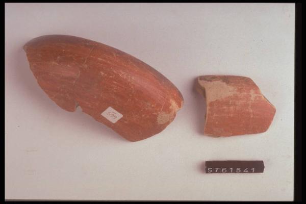 Ciotola emisferica, orlo rientrante arrotondato. Superficie estena rosso corallo con fascia nera lungo l'orlo.